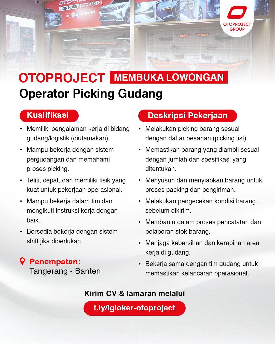 OTOPROJECT membuka lowongan Operator Picking Gudang untuk penempatan Tangerang, Banten. Kami mencari lulusan SMA/SMK yang teliti, memiliki fisik kuat, serta mampu bekerja dengan sistem picking dan pergudangan untuk memastikan kelancaran pengiriman barang kepada pelanggan.