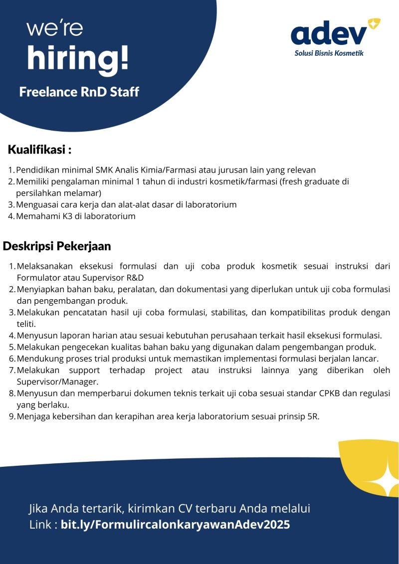 • Memiliki pengalaman minimal 1 tahun di industri kosmetik/farmasi (fresh graduate di persilahkan melamar)