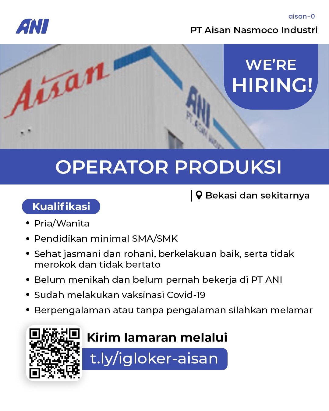 PT Aisan Nasmoco Industri membuka lowongan Operator Produksi untuk penempatan Bekasi dan sekitarnya. Posisi ini berperan dalam mendukung proses produksi sesuai standar perusahaan dengan kondisi kerja yang disiplin, sehat jasmani dan rohani, serta kesiapan mengikuti ketentuan perusahaan.