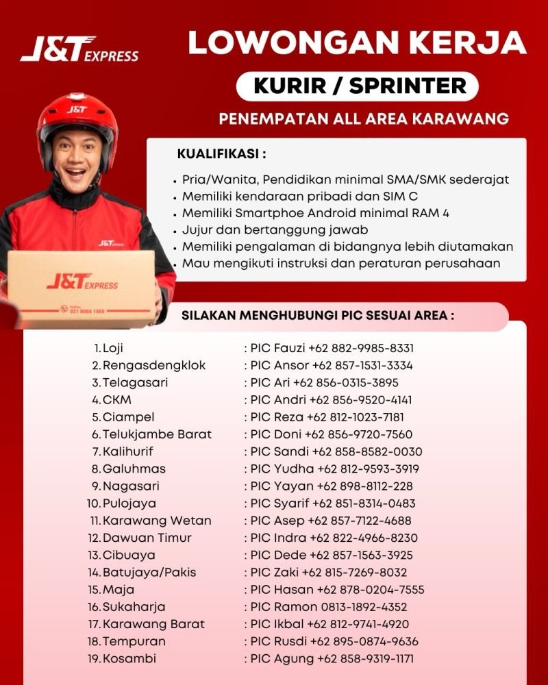 Saat ini PT Global Jet Express (J&T Express) kembali membuka lowongan kerja terbaru pada bulan Januari 2026. Adapun dibawah ini adalah posisi jabatan yang saat ini tersedia bagi Anda para pencari kerja yang tertarik untuk mengembangkan karir Anda bersama PT Global Jet Express (J&T Express) dengan kualifikasi sebagai berikut.