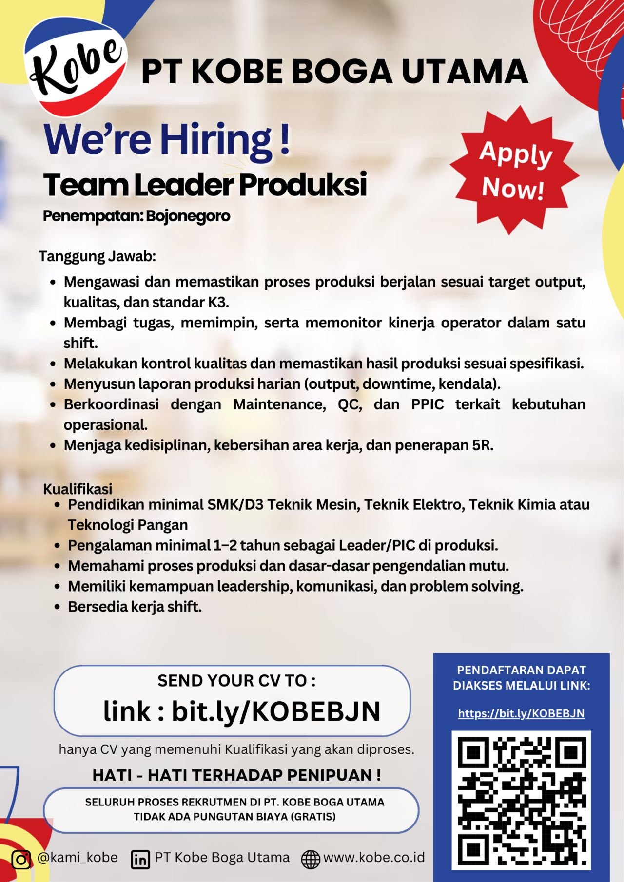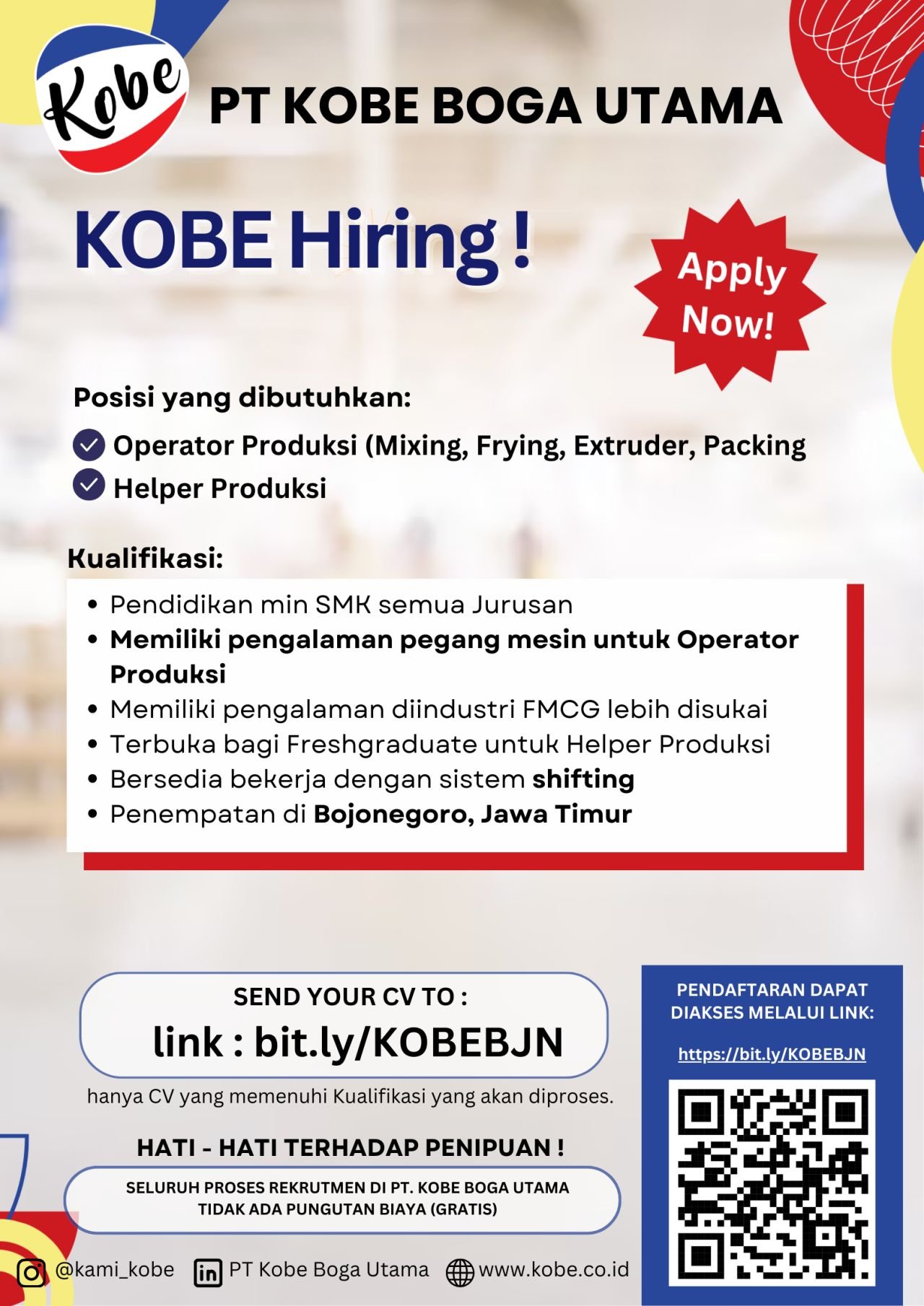 Saat ini PT Kobe Boga Utama kembali membuka lowongan kerja terbaru pada bulan Desember 2025. Adapun dibawah ini adalah posisi jabatan yang saat ini tersedia bagi Anda para pencari kerja yang tertarik untuk mengembangkan karir Anda bersama PT Kobe Boga Utama dengan kualifikasi sebagai berikut