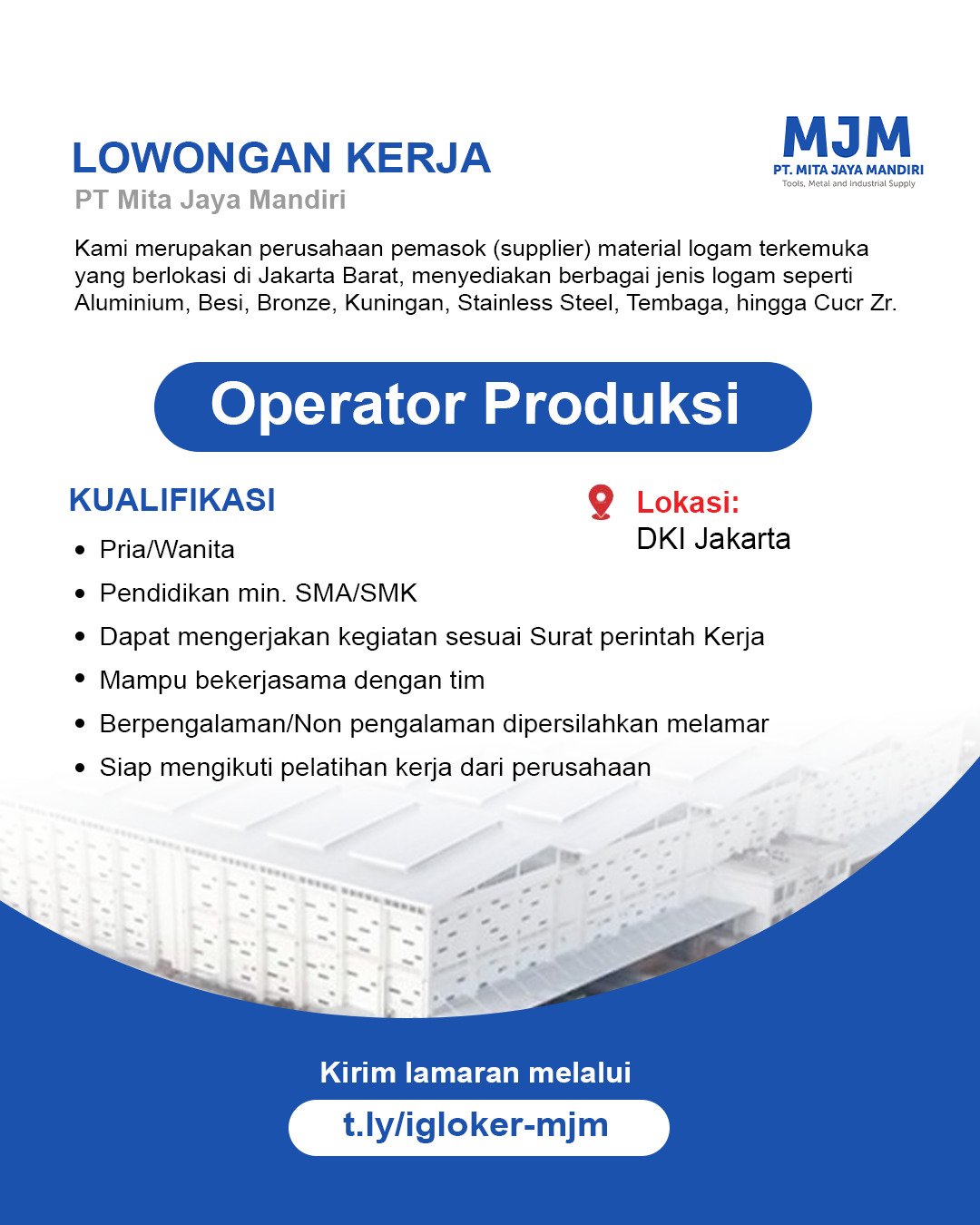 PT Mita Jaya Mandiri membuka lowongan Operator Produksi untuk penempatan DKI Jakarta. Posisi ini berperan dalam mengerjakan kegiatan sesuai Surat Perintah Kerja (SPK) serta bersedia mengikuti pelatihan kerja yang disediakan perusahaan.
