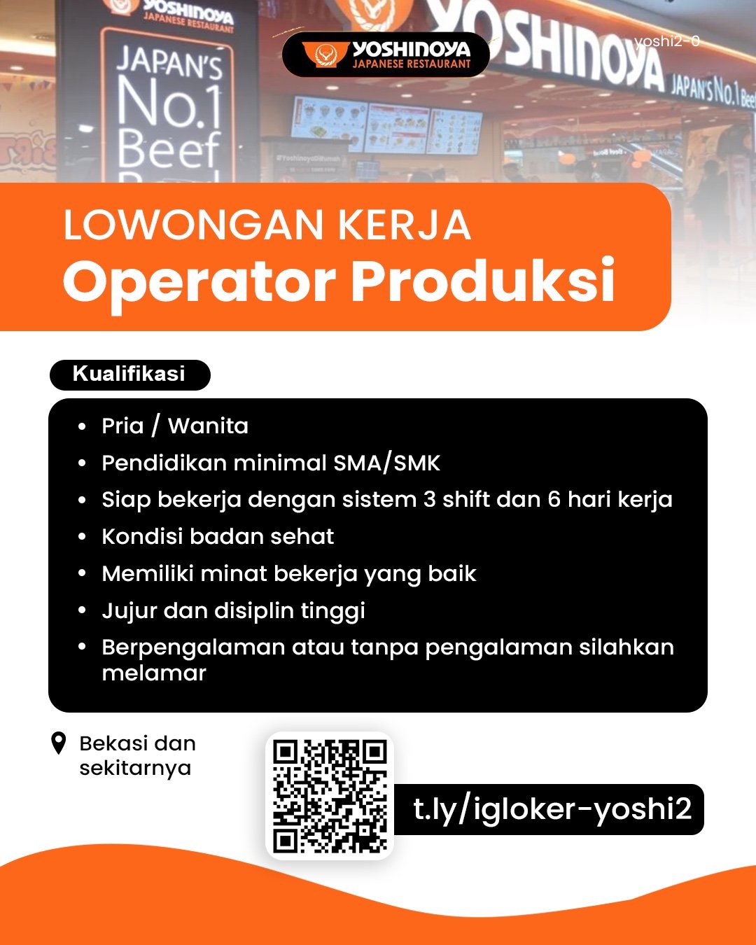 Yoshinoya membuka lowongan Operator Produksi untuk penempatan Bekasi dan sekitarnya. Posisi ini berperan dalam mendukung proses operasional produksi dengan sistem 3 shift, menjaga kedisiplinan kerja, serta memastikan kondisi kerja tetap optimal bagi tim.