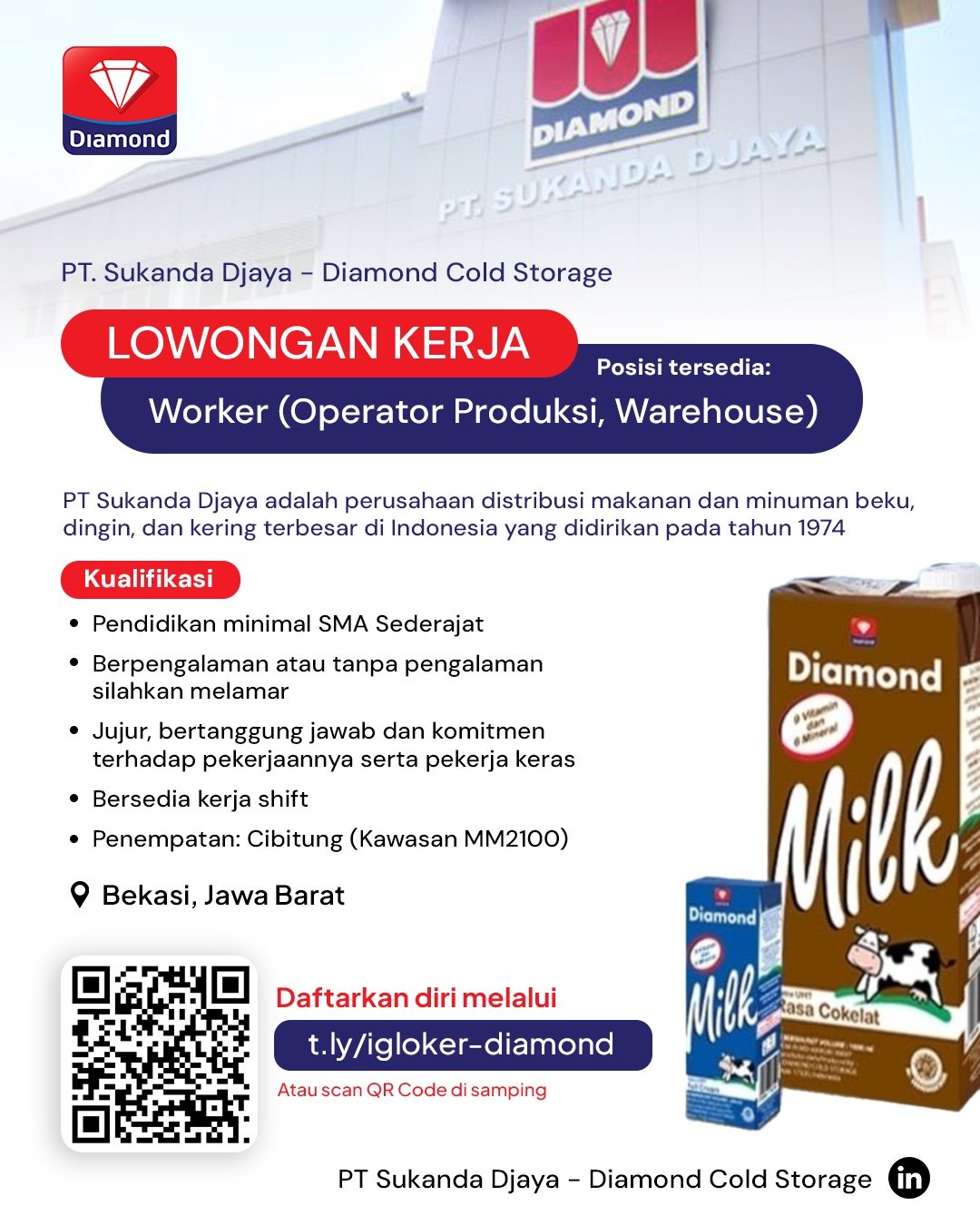 Diamond Cold Storage membuka lowongan Worker (Operator Produksi dan Warehouse) untuk penempatan Bekasi, Jawa Barat. Posisi ini berperan dalam mendukung operasional gudang dan produksi dengan sistem kerja shift.